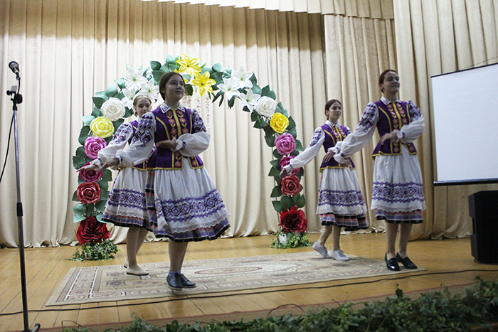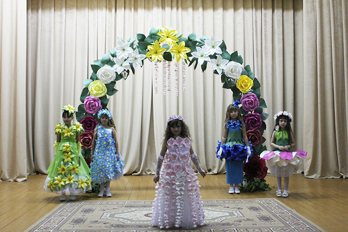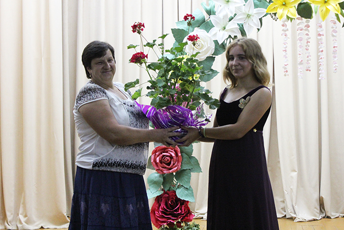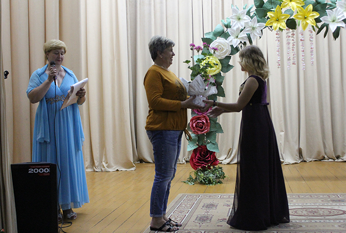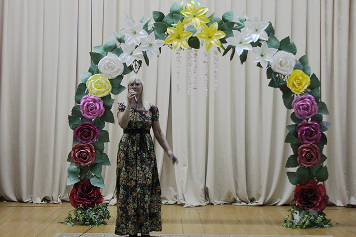 Затем собравшихся пригласили на концерт. В зале на сцене стояла удивительной красоты арка из цветов. У неё дефилировали юные красавицы в платьях ручной работы, автором и дизайнером которых выступила заведующий ЦДиК Инна Машкало. Каждый год она устраивает показ мод, украшает сцену. Именно её работ ждут гости праздника.