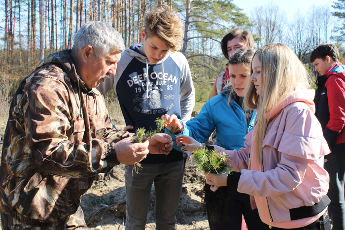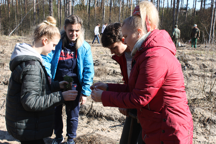 Десятиклассники с энтузиазмом принимаются за работу. Им на помощь приходят опытные лесники Михаил Воробей и Иосиф Жебровский. Лунка – саженец – прижать, лунка – саженец – прижать… Через несколько часов можно уже любоваться итогом совместного усердия и старания.