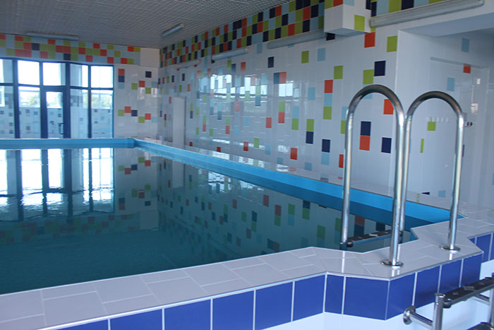 Сейчас на объекте ведутся последние приготовления к торжественному моменту. Мы вместе с директором государственного учреждения «ФОК «Принеманский» Дмитрием Ботько прошлись по пока что пустым раздевалкам и душевым, заглянули в бассейн, оценили яркое оформление малой ванны для детей, где на дне «спрятался» дельфинёнок, и сдержанность красок большого плавательного бассейна на четыре дорожки. Здесь уже всё готово к тому, чтобы принять первых посетителей: ванны наполнены водой, которая отсвечивает голубизной, везде порядок, чистота и необычная тишина – каждое слово эхом отдаётся под сводом полуовального деревянного потолка. Последние штрихи перед открытием наводят в фойе, сауне и тренажёрном зале.