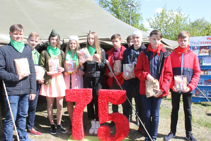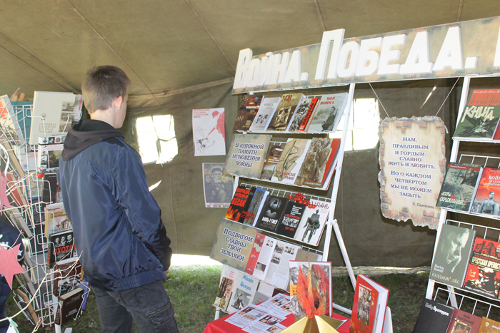 Целый полевой читальный зал под открытым небом «Книги памяти» был организован работниками районной библиотеки. Многие воспользовались возможностью познакомиться с военными газетами и атрибутикой того времени, выставкой книг о Великой Отечественной войне, сложить исторический пазл-реконструкцию «Оружие Победы» и открыть секрет необычного дерева, рассказывающего о совместной пресс-акции библиотеки и районной газеты «75 книг о войне».