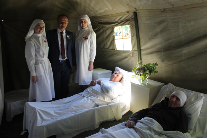 С интересом мостовчане и гости нашего райцентра знакомились с военно-полевым передвижным госпиталем, организованным центральной районной больницей и районной организацией Красного Креста. Здесь постарались воссоздать реальную картину минувших лет: в небольшой палатке медицинские сёстры и сёстры милосердия Красного Креста ухаживают за ранеными, а военврач отдыхает прямо в операционной после тяжёлой операции. А на улице – как в далёкие сороковые, сохнут бинты.