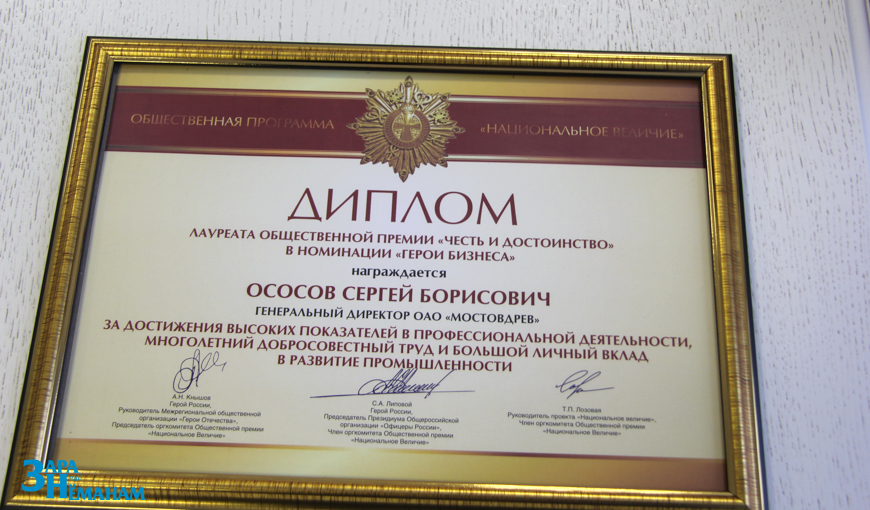 Накануне Нового года в Москве в Министерстве иностранных дел России состоялась торжественная церемония награждения лауреатов общественной премии «Честь и достоинство». В номинации «Герой бизнеса» был награждён дипломом и медалью генеральный директор ОАО «Мостовдрев» Сергей Ососов.
