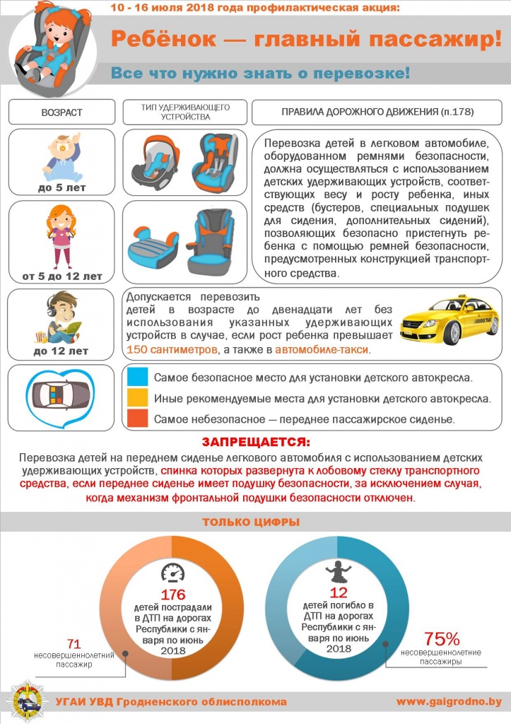 Как сообщили в ГАИ Гродненской области, с начала 2018 года на дорогах страны в 163 дорожно-транспортных происшествиях погибло 12 детей, 176 получили ранения. 71 несовершеннолетний стал участником ДТП в качестве пассажира. Среди детей, получивших в аварии смертельные травмы, 75 % составляют именно пассажиры.