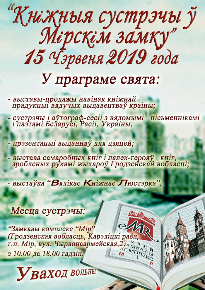 Мирский замок. Его мы знаем как уникальный памятник архитектуры, включенный в список всемирного наследия ЮНЕСКО, которым владели известные исторические личности Беларуси. Сегодня – это центр культурной жизни со своими брендовыми мероприятиями. Надеемся, что и этот новый для замка праздник «Кніжныя сустрэчы ў Мірскім замку» станет его отличительной особенностью.