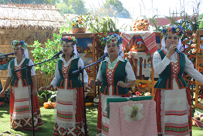 Задушевными песнями в исполнении вокальной группы «Чараўніцы» встречали участников праздничных мероприятий на подворье КСУП «Имени Адама Мицкевича». Украшен он был как всегда оригинально, красочно и богато – одни только куры-несушки из сена чего стоили!