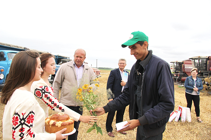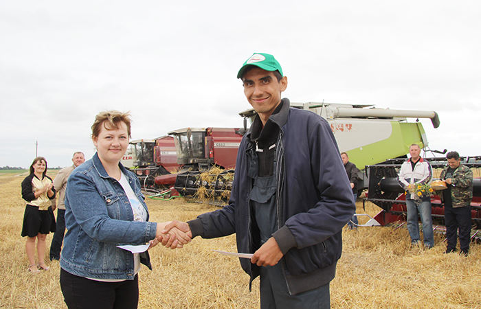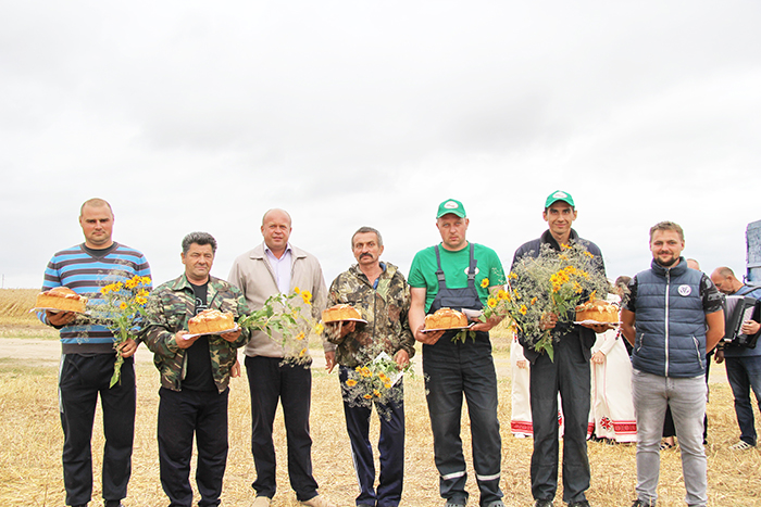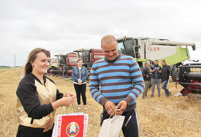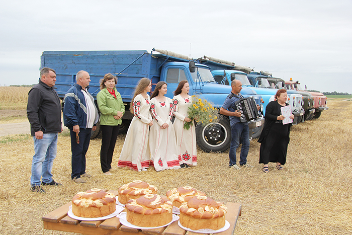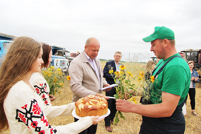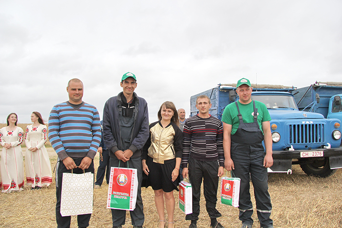 Этот небольшой праздник в поле в честь передовиков был очень торжественным. Андрей Санько, председатель профсоюзной организации Екатерина Валюшко, артисты вручили им большие караваи, цветы и, конечно же, награды.