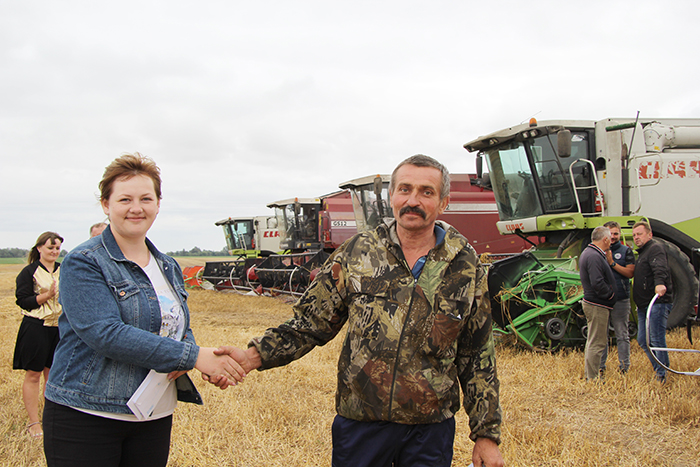 Первый секретарь райкома БРСМ Ольга Юревич вручила подарки победителям районного соревнования молодым комбайнерам ЗАО «Гудевичи» Андрею Мешко и Павлу Заневскому, а также молодым водителям Виталию Костко и Евгению Прудилко, намолотившим и перевёзшим свыше тысячи тонн зерна вместе с рапсом.