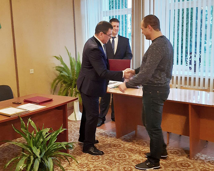 Он вручил Благодарственное письмо председателя Мостовского районного Совета депутатов аппаратчику получения сухого крахмала Иосифу Тышкевичу за добросовестный труд, образцовое выполнение трудовых обязанностей и личный вклад в развитие сельскохозяйственной отрасли Мостовского района. Почётную грамоту получил загрузчик-выгрузчик Александр Михалюк.