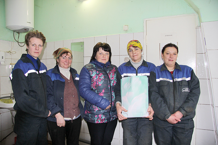 В конце смены в бытовой комнате собрались животноводы комплекса. В этот день был день рождения Светланы Якубович. Коллеги по работе тепло поздравили женщину, вручили ей подарок.