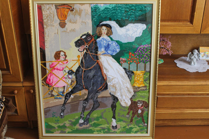 С первого взгляда и не скажешь, что всё это вышито крестиком. Люди, дома, животные – всё играет красками, «оживляя» картину. Кажется, будто пришпоренная лошадь вотвот пустится галопом, оставляя за собой столб пыли и белый шлейф шляпки своей статной молодой наездницы. Правда, есть в работе и свой авторский штрих мастерицы – это куст сирени и цветущие деревья на заднем плане. Отойти от оригинала пришлось изза напряжённости работы.
