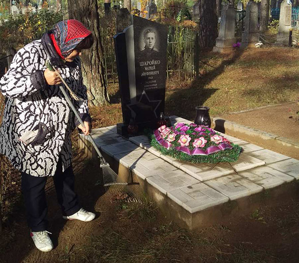 У братской могилы участники акции подгребли опавшие листья, вынесли мусор, очистили швы плитки от заросшего мха. Убрали иглицу и опавшие листья с могилы погибшего от бандитов младшего лейтенанта Матвея Шаройко.