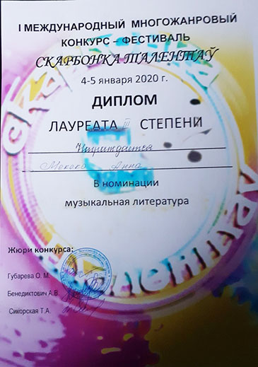Дипломом лауреата III степени в возрастной категории 12-13 лет награждена ученица третьего класса Мостовской ДШИ Анна Мекеко. Она выступила в номинации «Музыкальная литература» с презентацией «Мой любимый композитор». Анна в необычной форме рассказала о Франце Шуберте, личном отношении к композитору. Исполнила «Серенаду», чем приятно удивила членов жюри.
