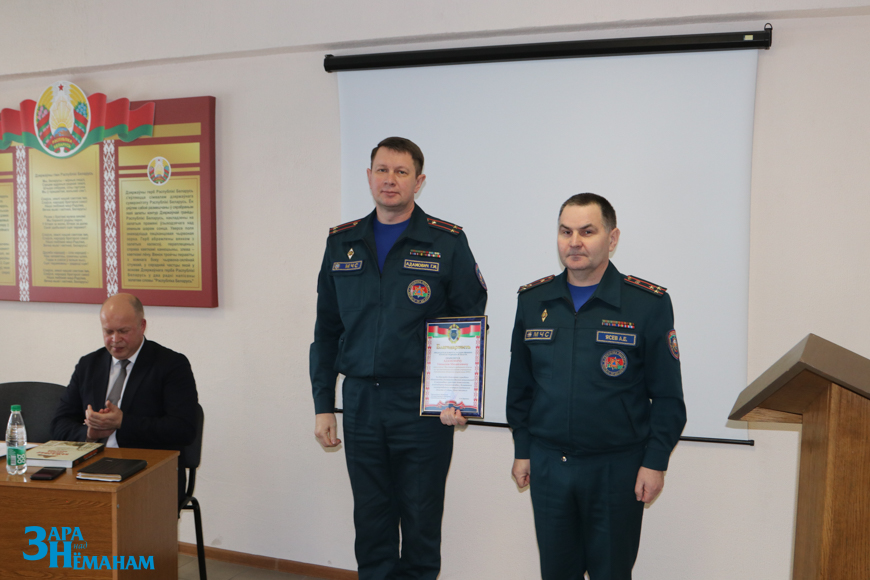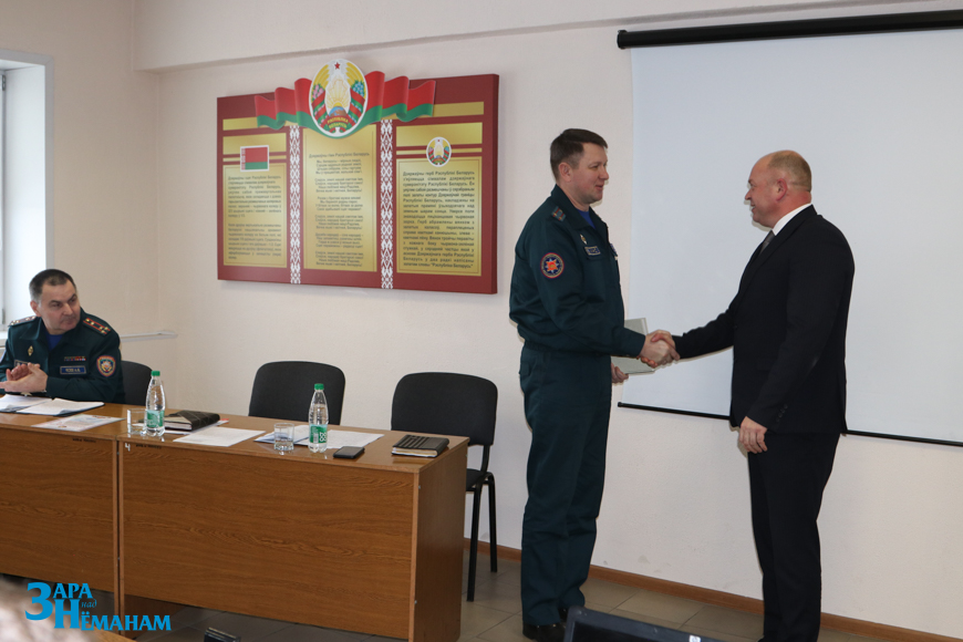 Подводя итог совещания, Александр Ясев дал объективную оценку деятельности отдела, отметил положительные моменты, обозначил направления, требующие совершенствования, и вручил заслуженные награды работникам районного отдела МЧС. Благодарность Председателя Комитета Государственно госконтроля по Гродненской области объявлена начальнику Мостовского РОЧС Геннадию Адамовичу, а Почётная грамота Гродненского областного управления МЧС вручена Андрею Дебёло.