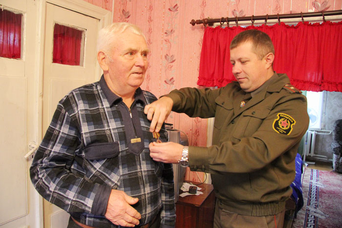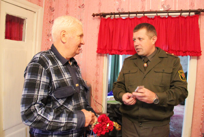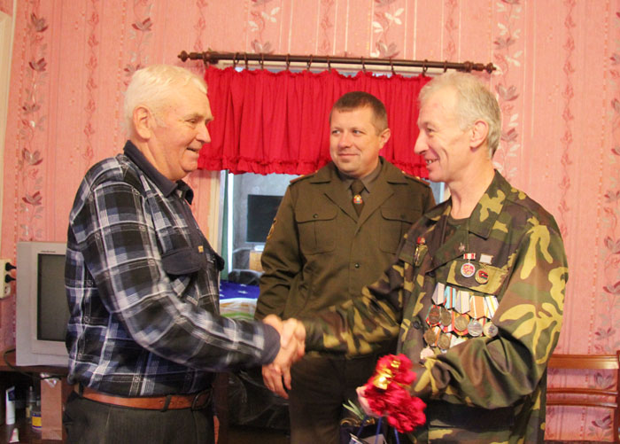 Встретил гостей Леонид Иванович у калитки своего деревянного дома на центральной улице агрогородка Лунно. Он был бодр, в хорошем настроении, пригласил всех в дом. С.Ткачук вручил афганцу цветы и подарок, а майор А.Бричиков прикрепил к его груди медаль  «100 год Узброеным Сілам Рэспублікі Беларусь». И конечно же, гости поздравили ветерана, высказали много хороших пожеланий.