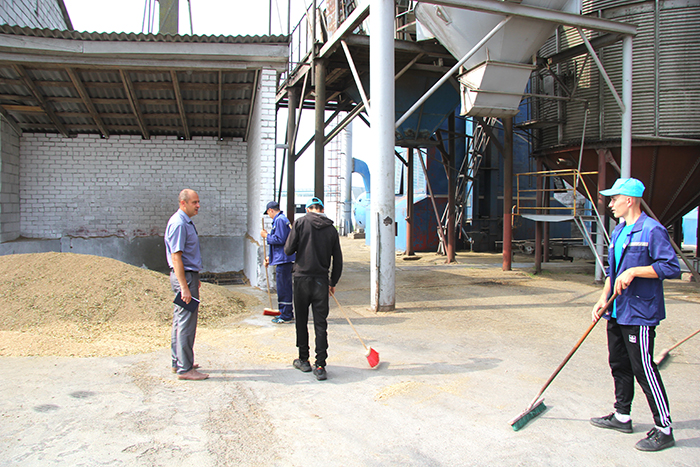 – Это наша первая практика, – говорит студента Елена, – убираем территорию зернотока, а заодно и знакомимся с технологией сушки зерна. Сначала шёл рапс, теперь поступает зерно пшеницы. С каждым днём нагрузка на зерносушилку всё больше. Но операторы справляются. Нам обеспечены безопасные условия труда, проводится инструктаж.