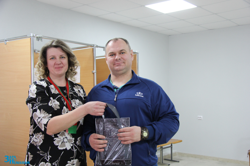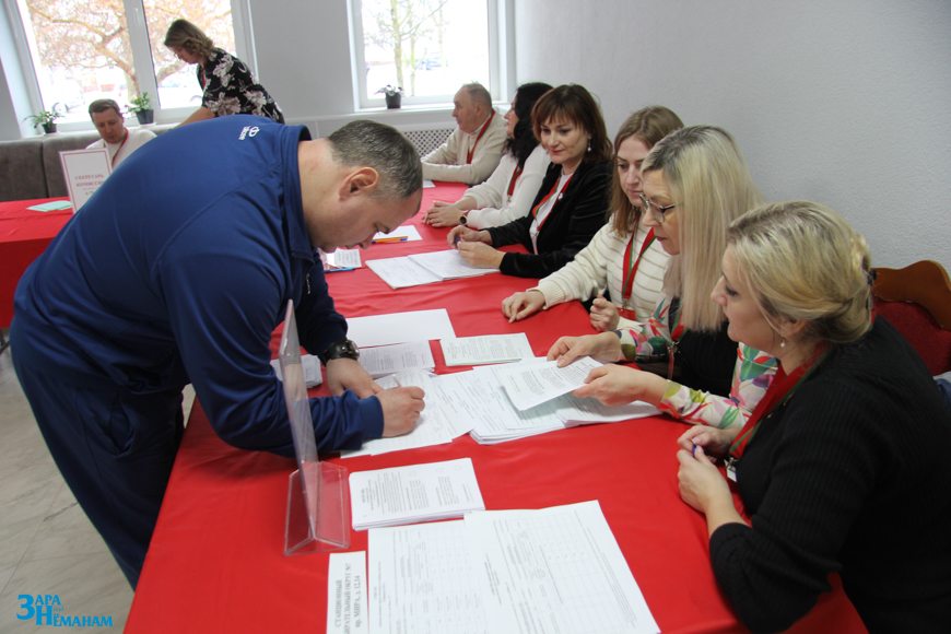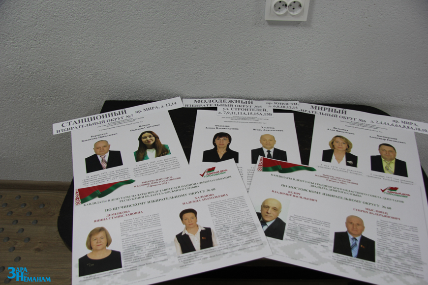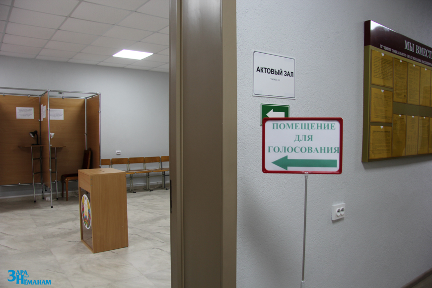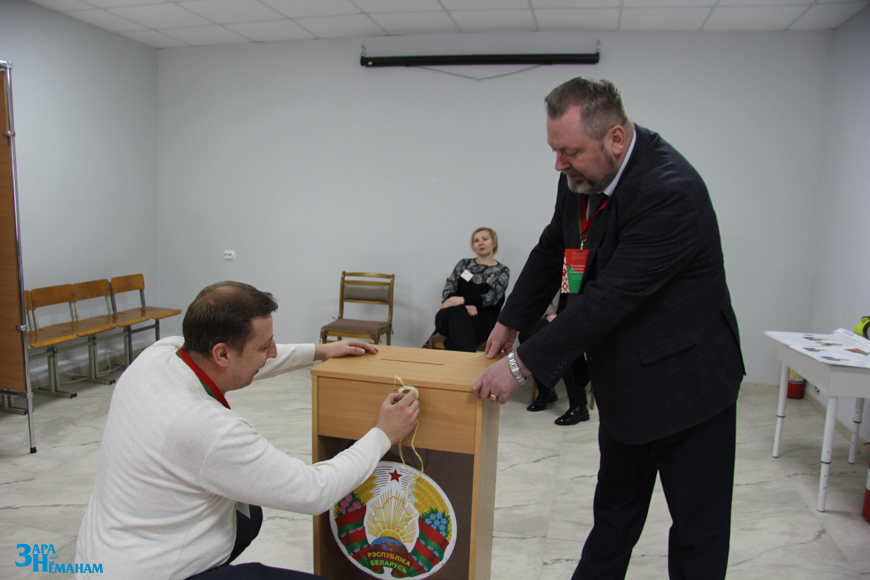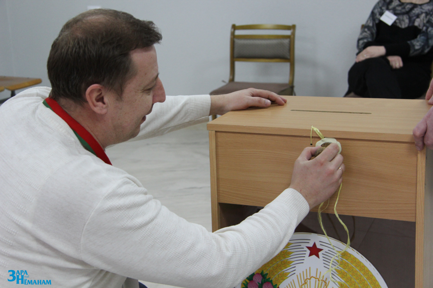 Ровно в 12 часов прошло опечатывание урны для голосования. С началом выборов поздравил членов участковой комиссии её председатель. А вот уже и первый избиратель. Он предъявляет свой паспорт, получает три бюллетеня. С хорошим настроением мостовчанин голосует. От избирательной комиссии получает подарок, как первый проголосовавший. На участок начали приходить и другие избиратели.