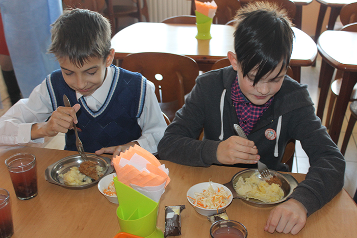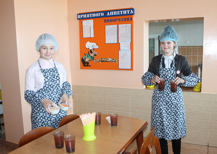 Когда до конца урока остаётся 5-7 минут, в помещении школьной столовой на 60 посадочных мест появляются дежурные. Девочки и мальчики надевают шапочки, фартуки, нарукавники и накрывают на столы.