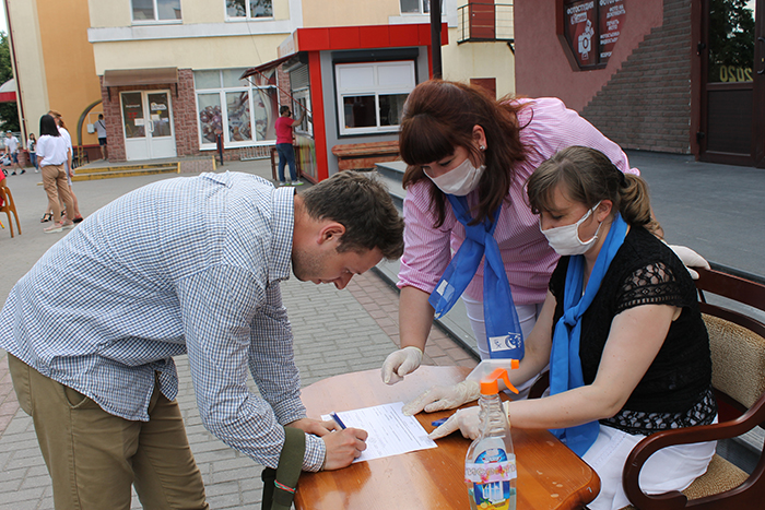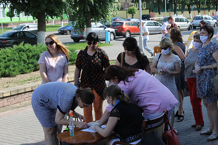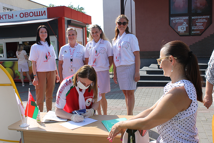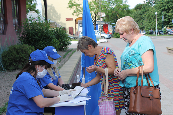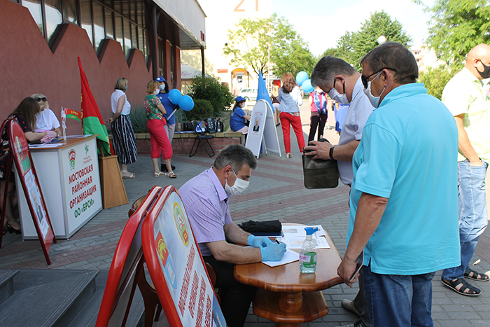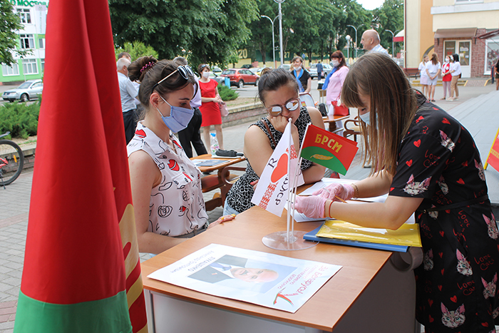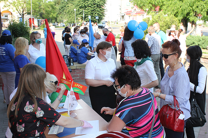 Активисты районный организаций общественных объединений «Белая Русь», Белорусский союз женщин, Белорусский республиканский союз молодёжи, Коммунистическая партия Беларуси и профсоюза выставили свои пикеты на улице Советской возле кинотеатра «Современник». Здесь звучала музыка, привлекая прохожих к участию в мероприятии.