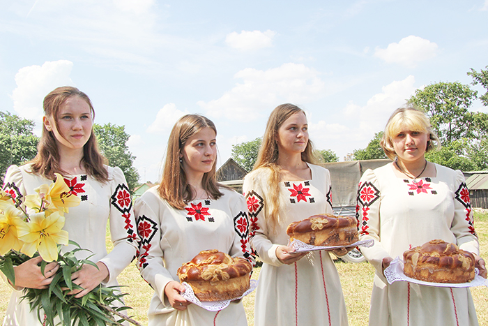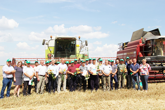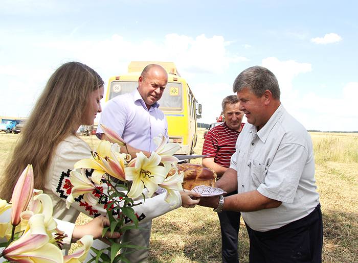 Чествование проходило на зерновом поле за деревней Радевичи. На краю загонки в линейку стали участвующие в уборке комбайны, автомобили и трактора.