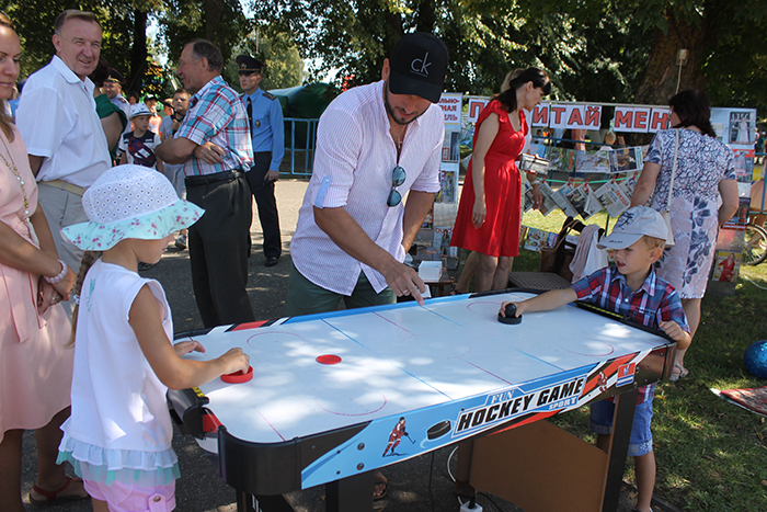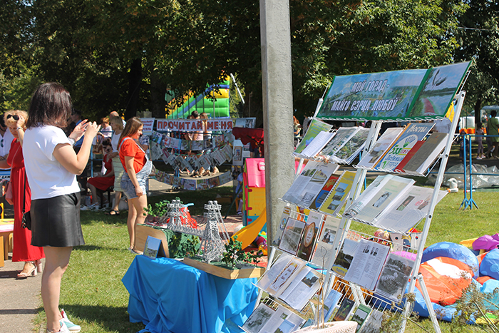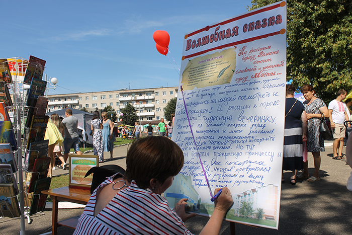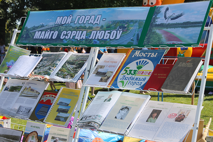 Работники библиотеки представили книжные выставки «Мой горад – майго сэрца любоў» и «Вокруг книги», газетно-журнальную карусель «Прочти меня», предлагали написать сказку о Мостах, поучаствовать в лототроне «Рецепт хорошего настроения». На площадке у стадиона «Неман» они также расположили и настольный хоккей и футбол, в которых могли сразиться все желающие.