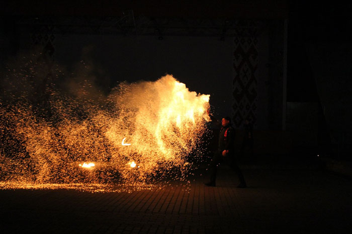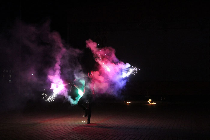 Финальным штрихом этого вечера стало фаер-шоу от лидской бригады «Огненные Вороны». Эта группа уже не в первый раз приезжает к нам в город. В прошлом году они также согревали своей программой на торжественной церемонии зажжения огней на ели. В этот раз «жаркие птицы» продемонстрировали ещё более захватывающее и впечатляющее шоу. Огненные, пиротехнические и спаркл - выступления не оставили равнодушным никого! Они как будто жонглировали огнём под новогодние песни.