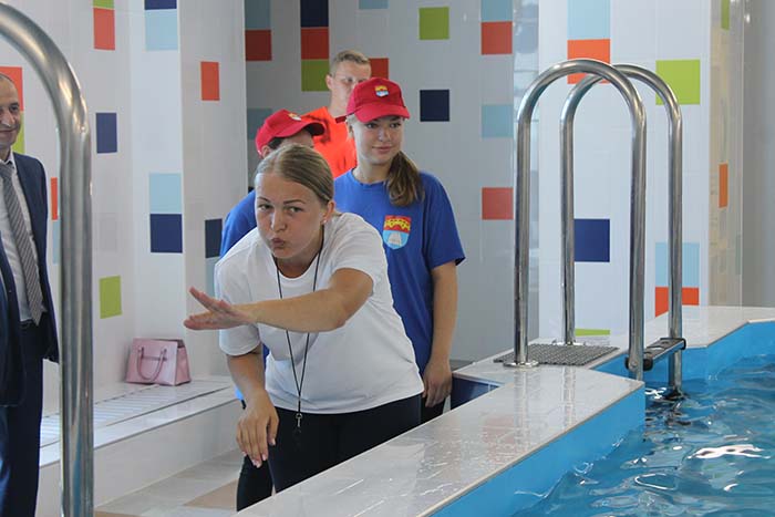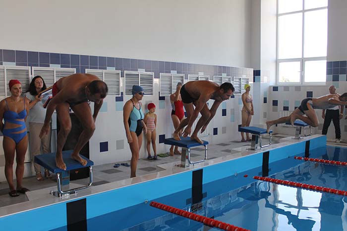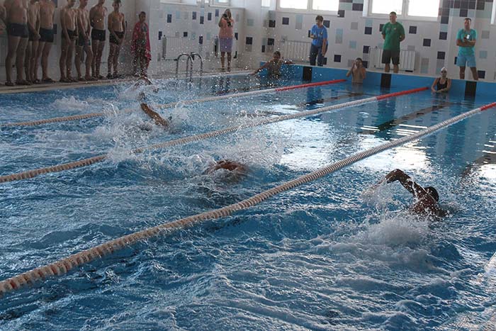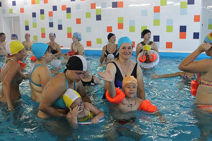 А за распахнувшимися дверями физкультурно-оздоровительно комплекса – уже живёт спортивный дух вместе с хозяйкой бодрости и веселья. Брызги, радостные возгласы и свисток инструктора: в маленьком бассейне проходит занятие по аквааэробике для мам и детей. А в большом бассейне – на старте семьи, готовые посостязаться друг с другом, а также ребята старшего возраста, которые будут оттачивать здесь свои плавательные навыки.