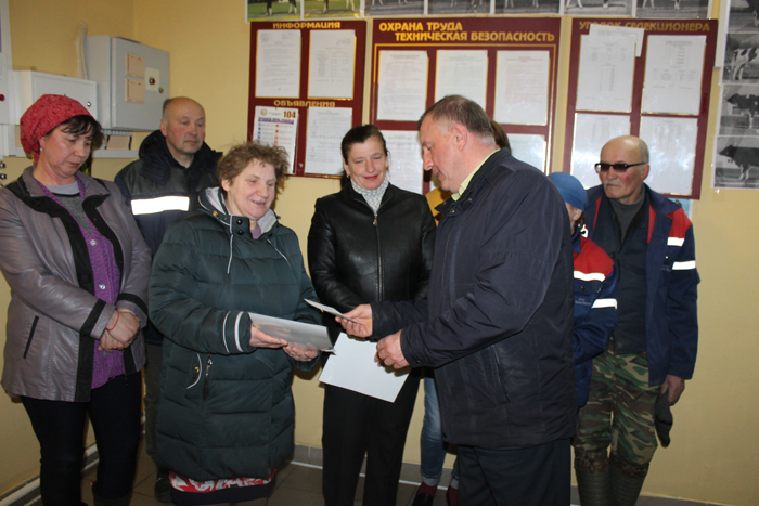 Самой же женщине и её коллегам хороших привесов и надоев, дальнейших профессиональных успехов и семейного благополучия желали заместитель директора по идеологической работе Владимир Потапов и председатель профкома хозяйства Алла Булочка.