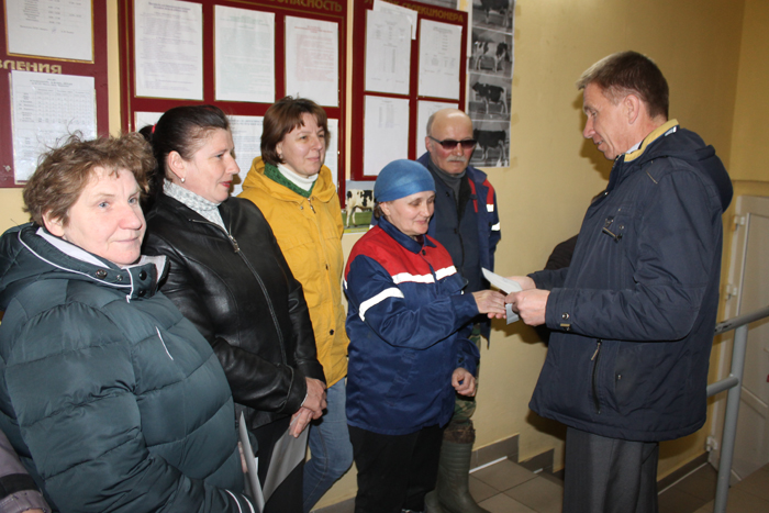 Присоединились к поздравлениям работников Г.В. Нагуй, Т.Я. Сакович, М.Б. Салминой, Ю.Н. Ботько, Т.А. Конопко также руководитель хозяйства Владимир Писаревич, председатель профкома Татьяна Кревская.