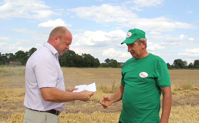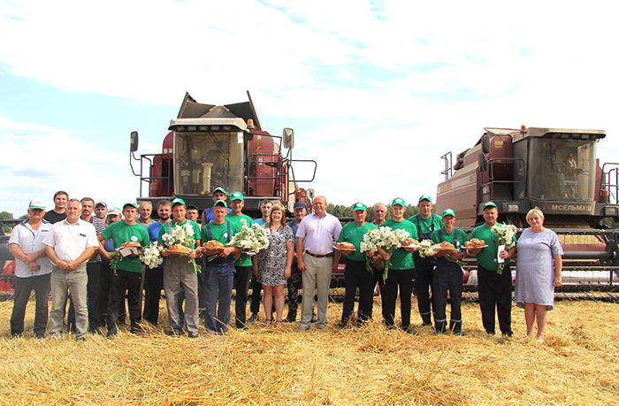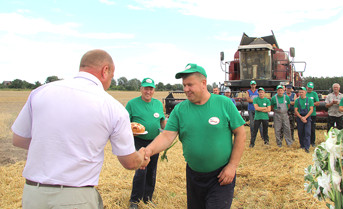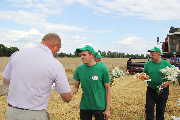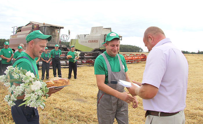 -- Уже четвёртую неделю идёт напряжённая работа в поле на жатве, -- сказал Андрей Антонович.— Каждая тонна зерна добывается трудом и потом всех участников уборки. Наши комбайнёры и водители трудятся очень ответственно и слаженно. И как результат убрано уже почти 90 процентов площадей зерновых. Урожай близок к 60 центнерам с гектара. Осталось убрать самые трудные участки, где много полёглицы. Но я уверен: вы справитесь, уберёте всё чисто и аккуратно.