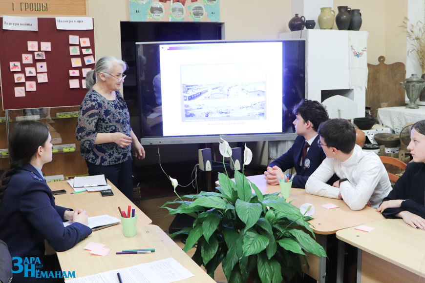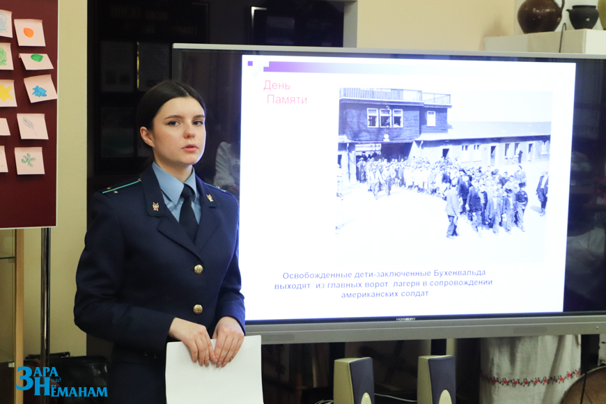 – По решению ООН 11 апреля во всём мире отмечается Международный день освобождения узников фашистских концлагерей. Он установлен в память об интернациональном восстании в Бухенвальде, которое произошло в этот день в 1945 году. Узники захватили лагерь и удерживали его до прихода союзных войск. Освенцим, Майданек, Треблинка, Бухенвальд и много других мест на карте Европы были превращены в годы Второй мировой войны в лагеря смерти. Не меньшей жестокостью отличались концентрационные лагеря, созданные фашистами на территории Беларуси, которых насчитывалось более 260. Наиболее крупные из них находились в Минске – в районе Немиги, в Тростенце, а также в Озаричах, Гомеле, Полоцке и Бобруйске. В них были уничтожены свыше 1,5 млн человек, – рассказала ребятам представитель прокуратуры.