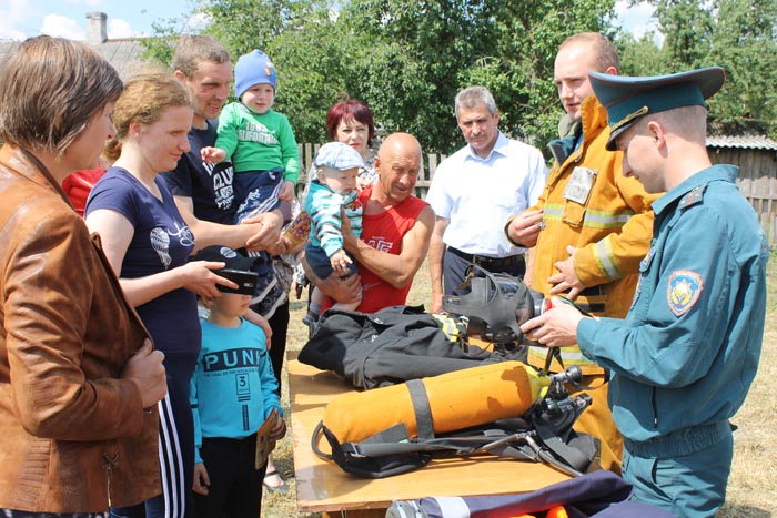 Мероприятие началось с показательных выступлений районного отдела по чрезвычайным ситуациям. Жители деревни познакомились с оборудованием и снаряжением спасателей, увидели способы тушения огня при помощи воды и пены, а затем стали свидетелями того, как на их сельской улице вырос настоящий фонтан.