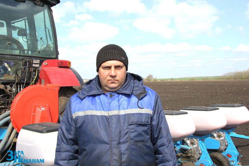 На другом участке недалеко от Радевич вёл сев кукурузы сеялкой «Моносем» механизатор Дмитрий Борисик.