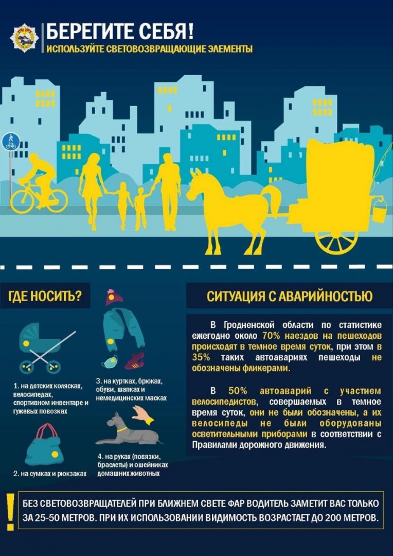 В связи с наступлением осени вырос риск происшествий с участием пешеходов. Опасно двигаться по обочине и вдоль проезжей части, а уж тем более пересекать её в тёмное время суток или в условиях недостаточной видимости, поскольку пешеход видит двигающийся транспорт благодаря включённым фарам, а водитель может и не заметить пешехода. Большое количество ДТП в этот период совершаются в темное время суток или в условиях ограниченной видимости.