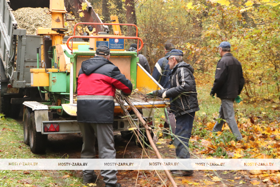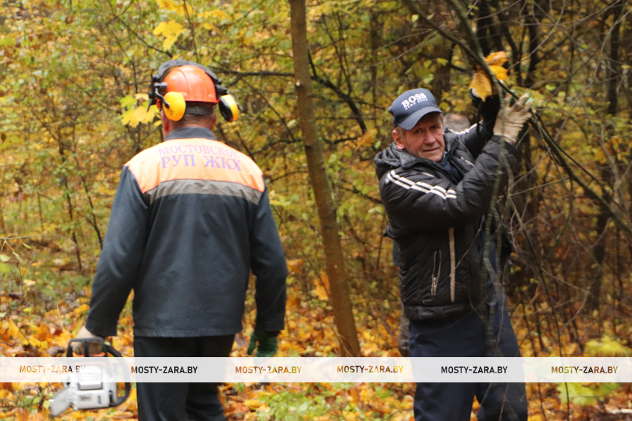 Пока женщины старательно выгребали листья, приводя в порядок пешеходные дорожки у дендропарка, мужчины решали более сложную и трудоёмкую задачу. Им нужно было убрать кусты и нависшую растительность вдоль лесной дорожки, по которой любят прогуливаться мостовчане.
