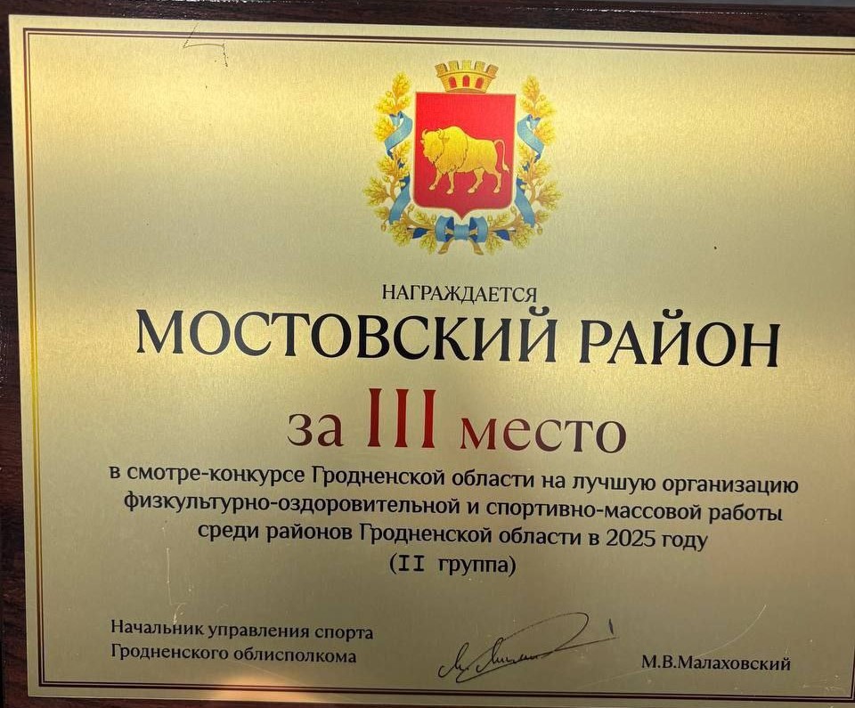 Сектор спорта Мостовского района занял 3 место в смотре-конкурсе Гродненской области на лучшую организацию физкультурно -оздоровительной и спортивно - массовой работы среди районов Гродненской области в 2025 году среди районов 2-й группы.