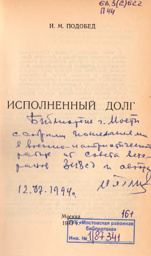 Книги о Великой Отечественной войне хранят память о героических подвигах и мужестве советского народа, напоминают нам, какой ценой досталась Победа. В рамках патриотического проекта Мостовской районной библиотеки и районной газеты «Зара над Нёманам» «Победный май в памяти и книгах», мы предлагаем вам, уважаемые читатели, перелистать страницы книги «Исполненный долг», автором которой является Подобед Иван Михайлович, ветеран Великой Отечественной войны, полковник в отставке, журналист, кандидат исторических наук, почётный гражданин города Мосты. Это издание занимает особое место в книжном строю. На титульной странице книги «Исполненный долг» Иван Михайлович Подобед оставил дарственную надпись: «Библиотеке г. Мосты с добрыми пожеланиями в военно-исторической работе от совета ветеранов 348 с.д. и автора [подпись] 12.07.1994 г.». В основе повествования – личные воспоминания и архивные материалы автора, рассказывающие о стойкости и мужестве воинов 348-й стрелковой Бобруйской Краснознамённой ордена Кутузова дивизии, освобождавшей Мостовский район от немецко-фашистских захватчиков. С 348-й стрелковой дивизией Подобед И.М. прошел весь её боевой путь от Подмосковья до Берлина и Эльбы, начав его рядовым солдатом, а закончив – офицером, помощником начальника политотдела дивизии по комсомолу.