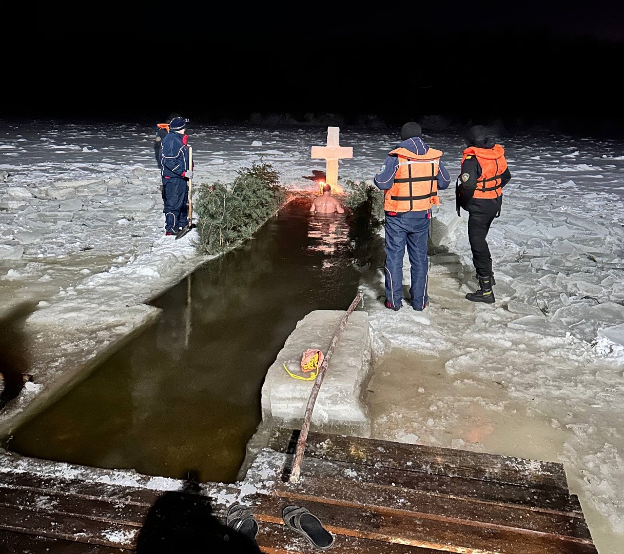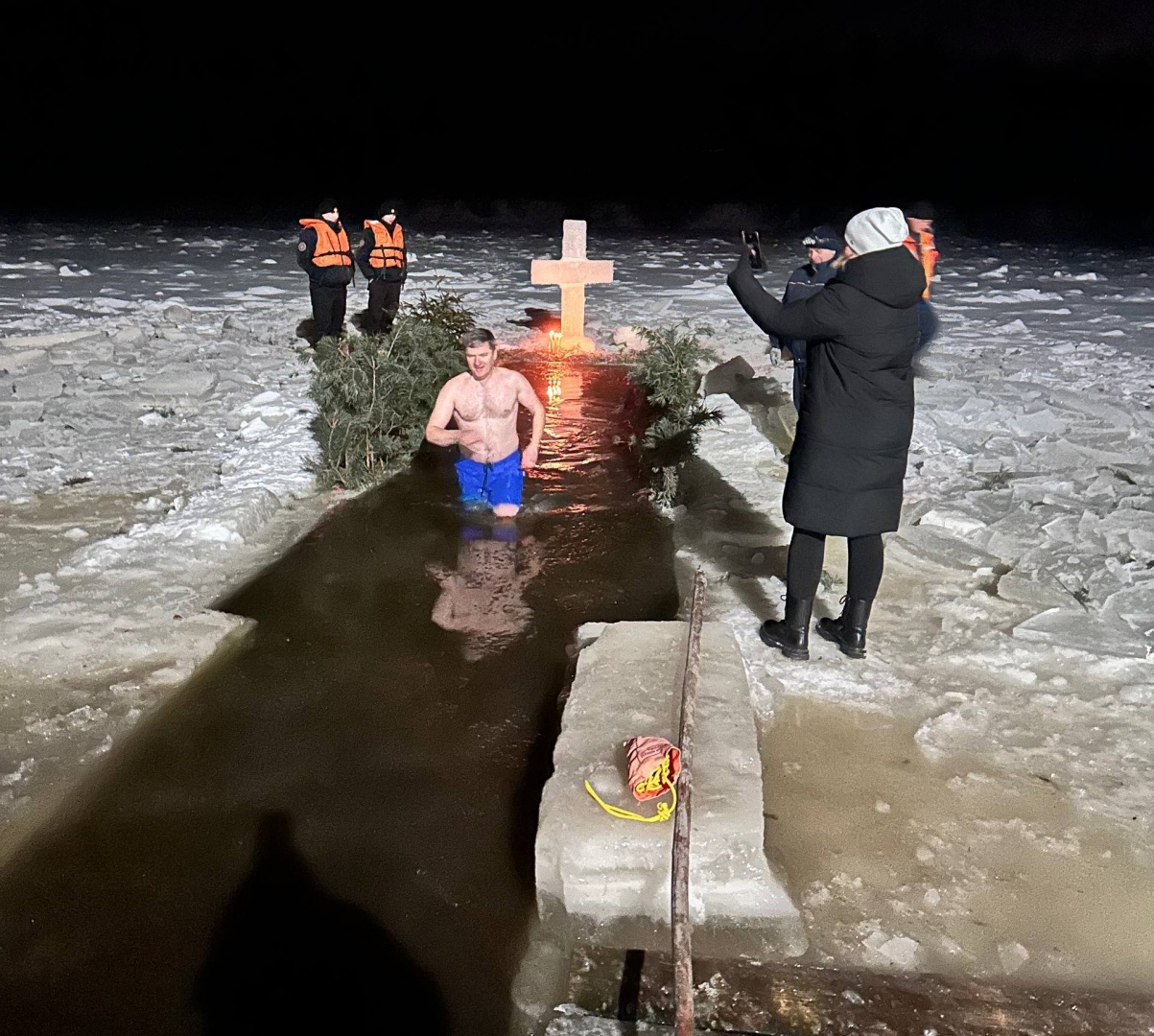 Стоит отметить, что ежегодно мостовские спасатели ответственно относятся к подготовке проруби. И если в прошлом году зима была бесснежной, то в этом им пришлось прорубать лёд, чтобы создать не только комфортные условия, но и праздничные. Также они постоянно находились у самой проруби, обеспечивая безопасность. Дежурство несла и бригада скорой помощи, готовая в любую минуту прийти на помощь. А руководитель районного отделения Белорусского Красного Креста Наталья Карпович всех угощала горячим чаем.