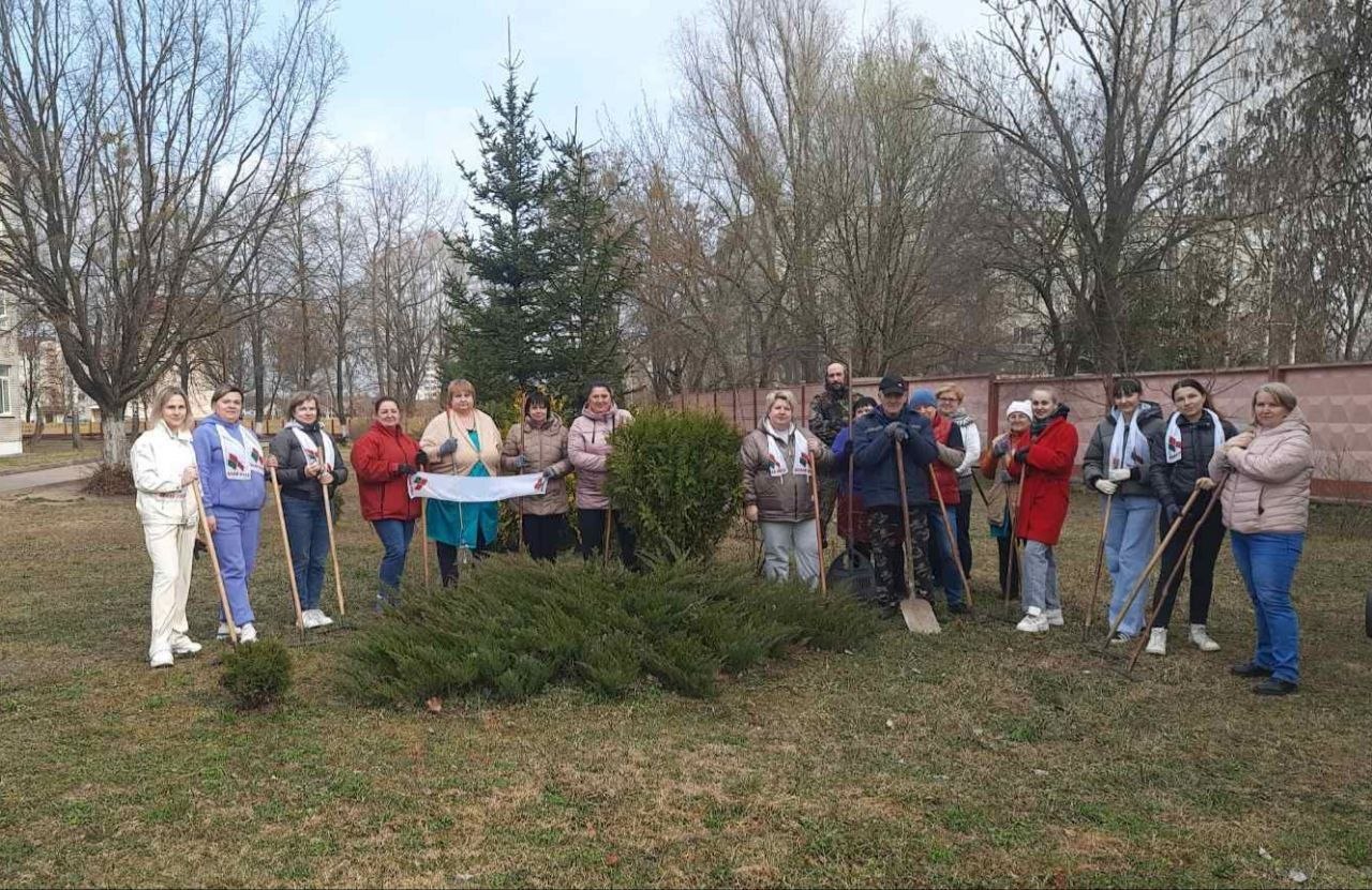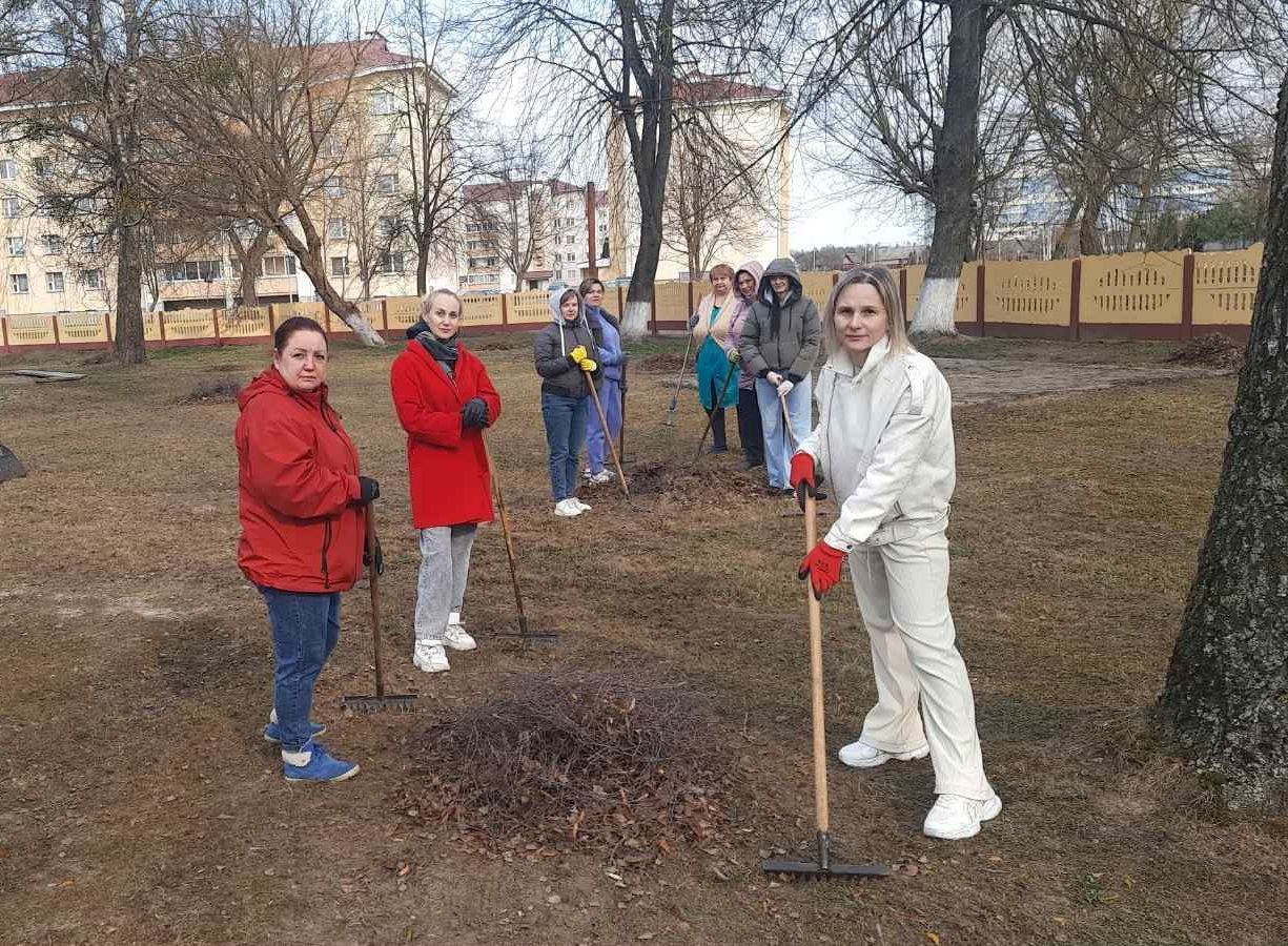 Дружная команда работников вышла на уборку школьной и прилегающих к учреждению образования территорий.