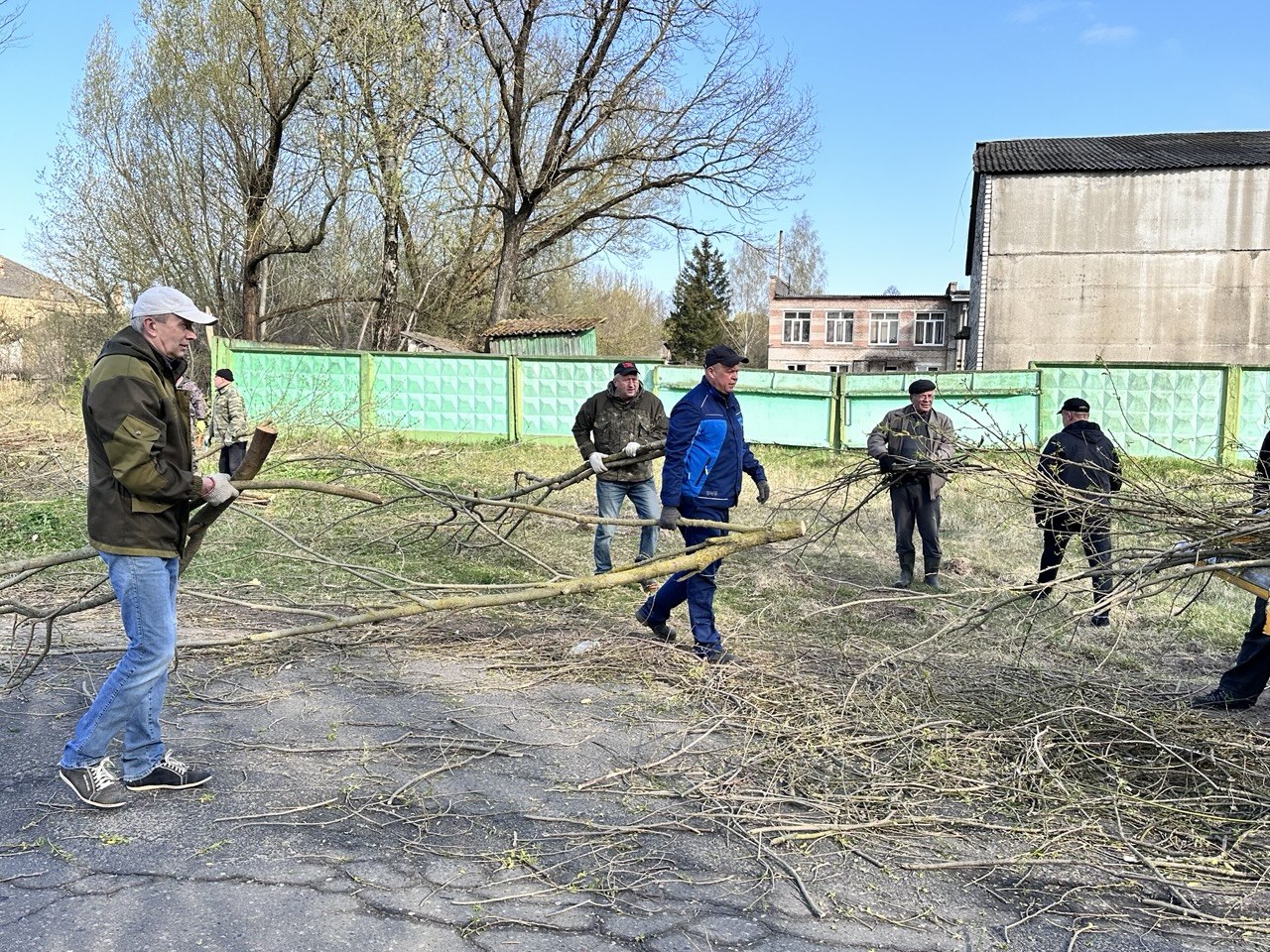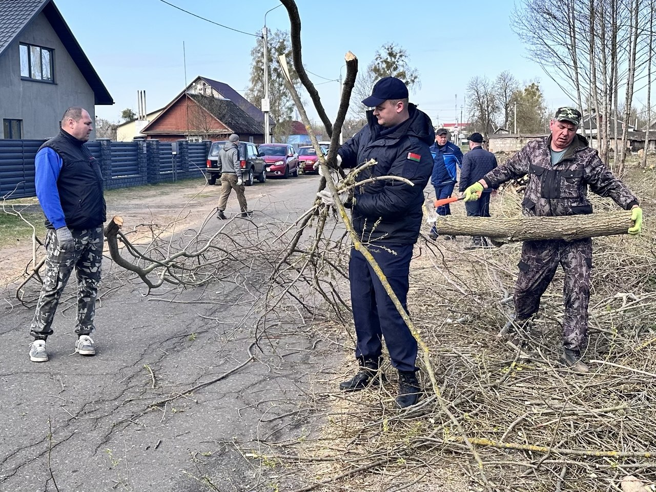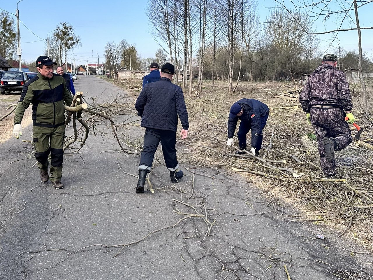 Заранее было определено несколько основных локаций, где запланированы самые масштабные работы. Продолжили с работы по ул. Вокзальная. Вот уже несколько субботу здесь работает мужская половина райисполкома под руководством главы района Андрея Санько и председателя районного Совета депутатов Валерия Табала, а также сотрудники РОЧС, прокуратуры. Здесь вычищаются дикая поросль, наклоненные и поваленные деревья. Затем придёт тяжёлая техника, которая уберёт корни, а уже потом засеется травой вся территория. Но уже сейчас сюда пробивается дневной свет и на улице стало гораздо светлее.