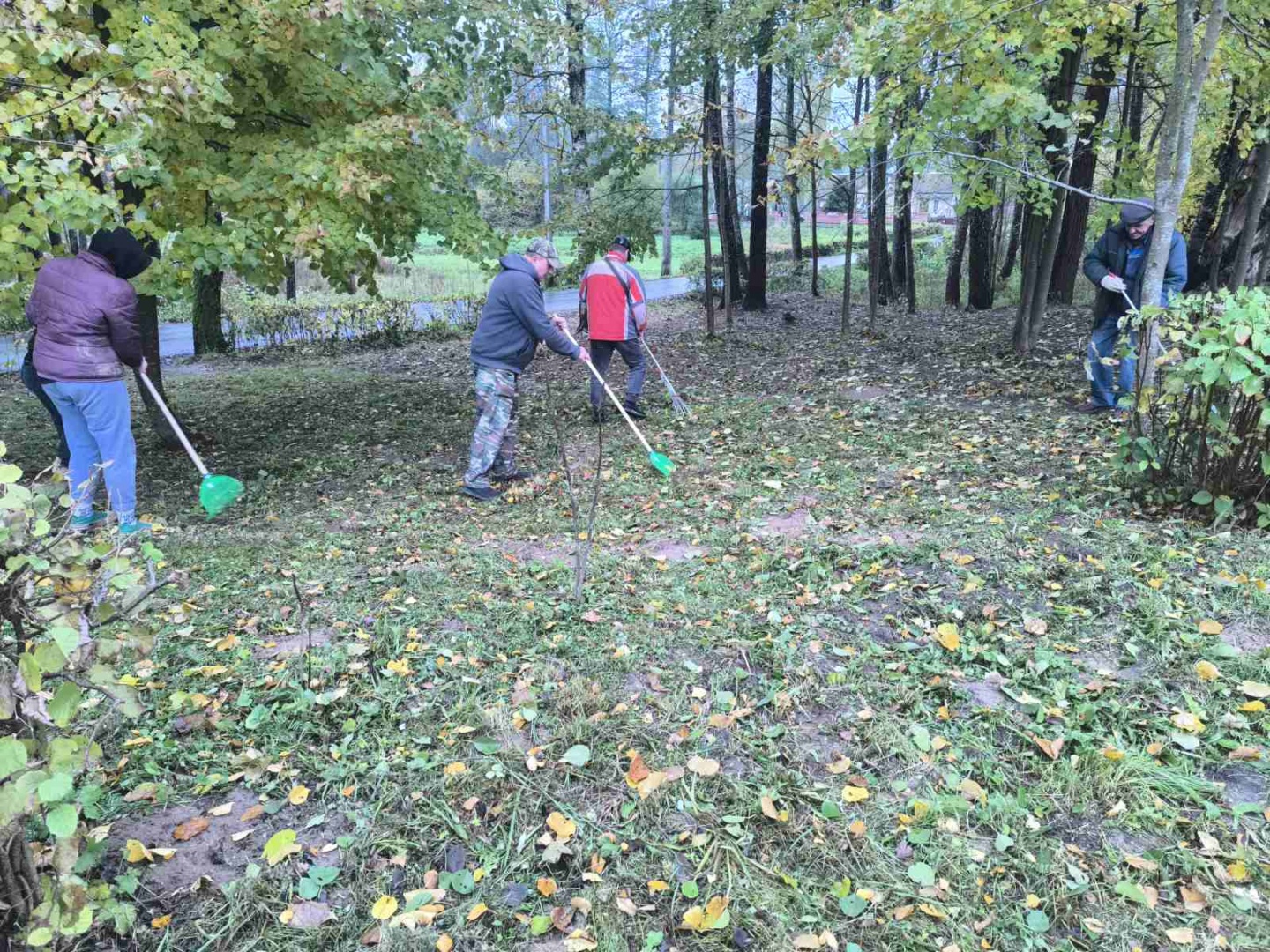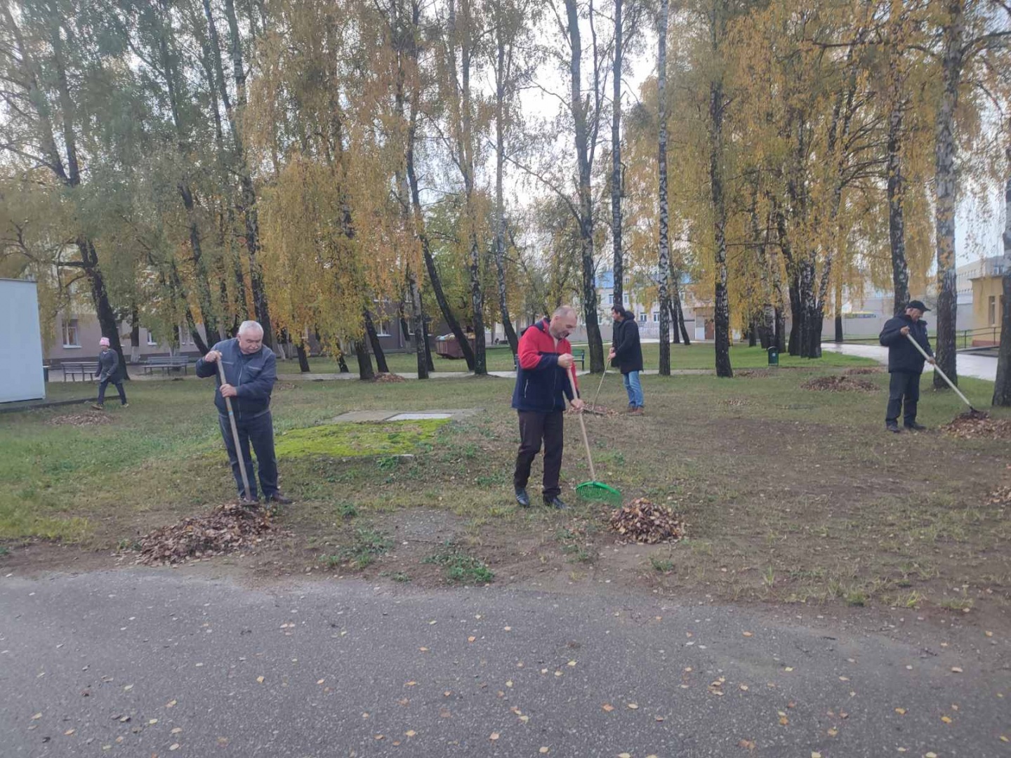 Внутренний дворик учреждения здравоохранения занимаю посадки берёзы. В эпятницу вечером после работы работники убирали их листья, что уже успели осыпаться на землю.