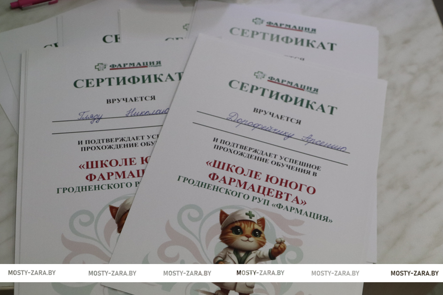В конце занятия каждый её участник получает сертификат, который подтверждает успешное прохождение обучения в «Школе юного фармацевта», и памятные подарки от Гродненского РУП «Фармация».