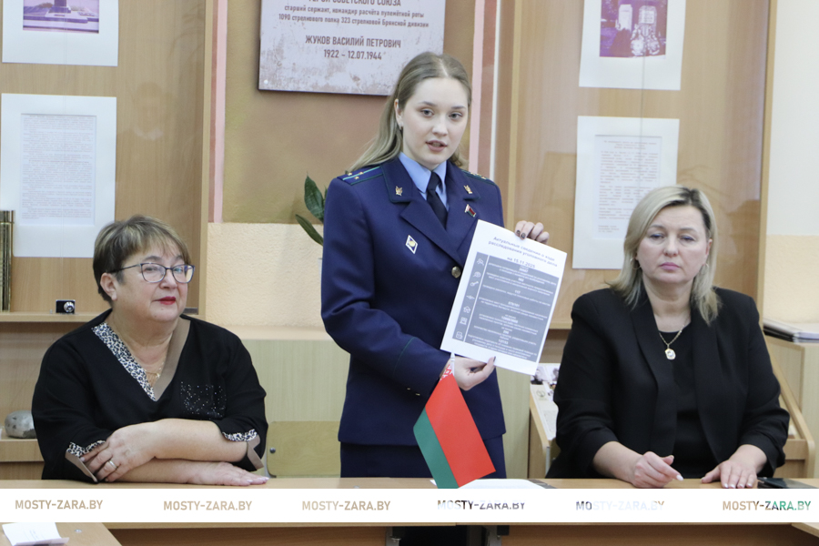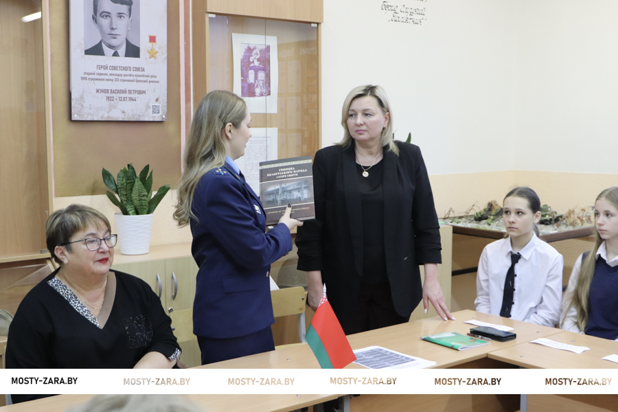 К теме геноцида белорусского народа обратилась и помощник прокурора района Анастасия Бальцевич. Она же подарила учебному заведению книгу «Геноцид белорусского народа. Лагеря смерти», подчеркнув, что издание проливает свет на многие события и трагедию белорусского народа в годы войны.