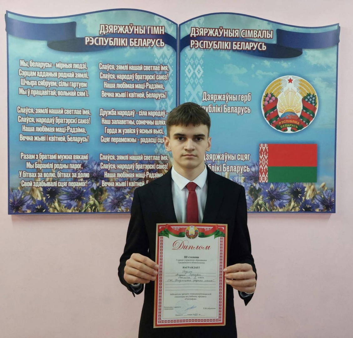 В январе этого года он получил диплом III степени на третьем (областном) этапе республиканской олимпиады па географии. Руководит подготовкой Андрея директор школы Дмитрий Мамович, сам по образованию учитель географии.