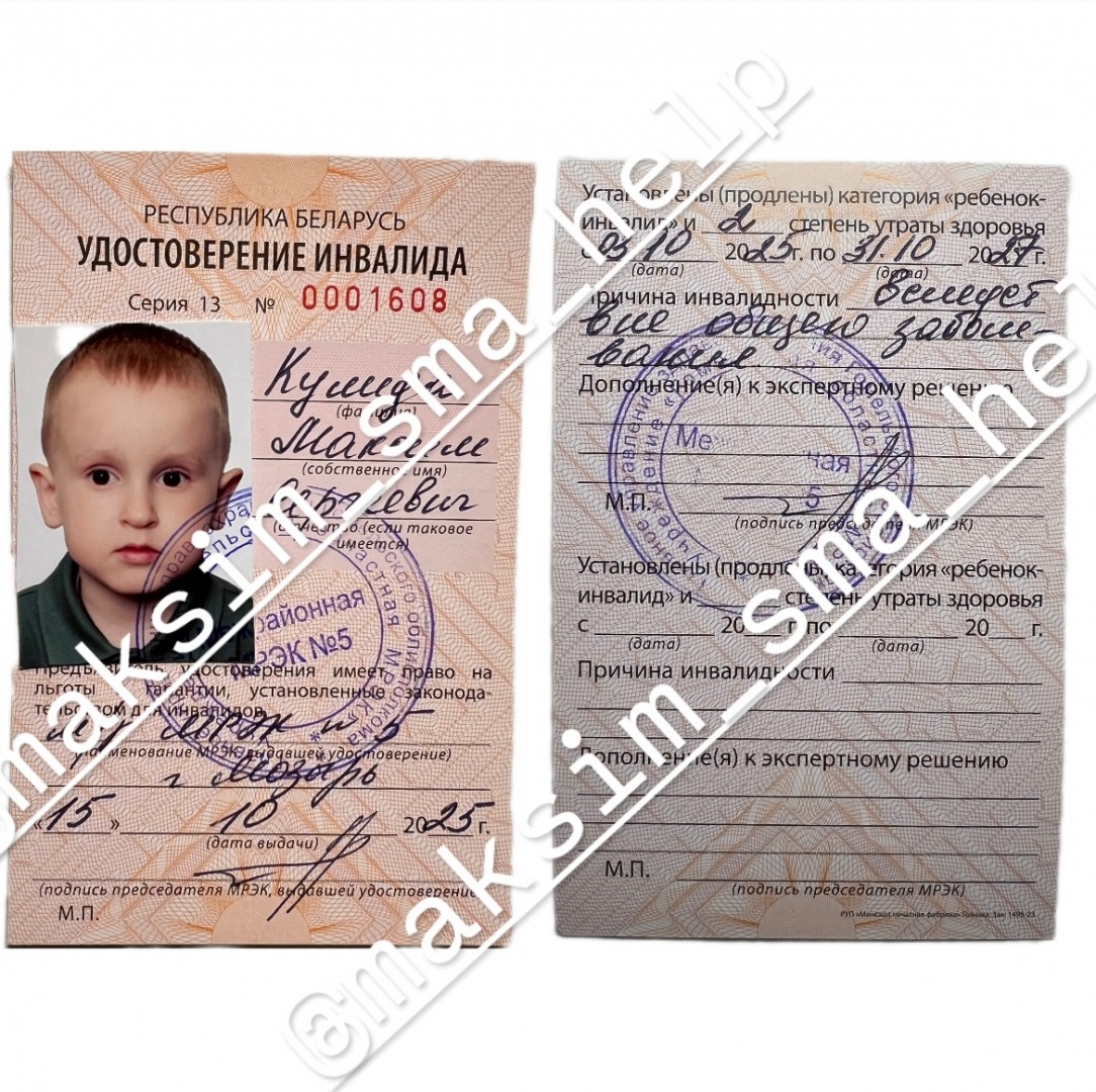 13 августа 2025 моему сыну Кулида Максиму Сергеевичу, 13.05.2021 года рождения, в ГУ «Республиканский научно-практический центр «Мать и дитя» был поставлен диагноз спинальная мышечная атрофия 3 типа (далее – СМА).