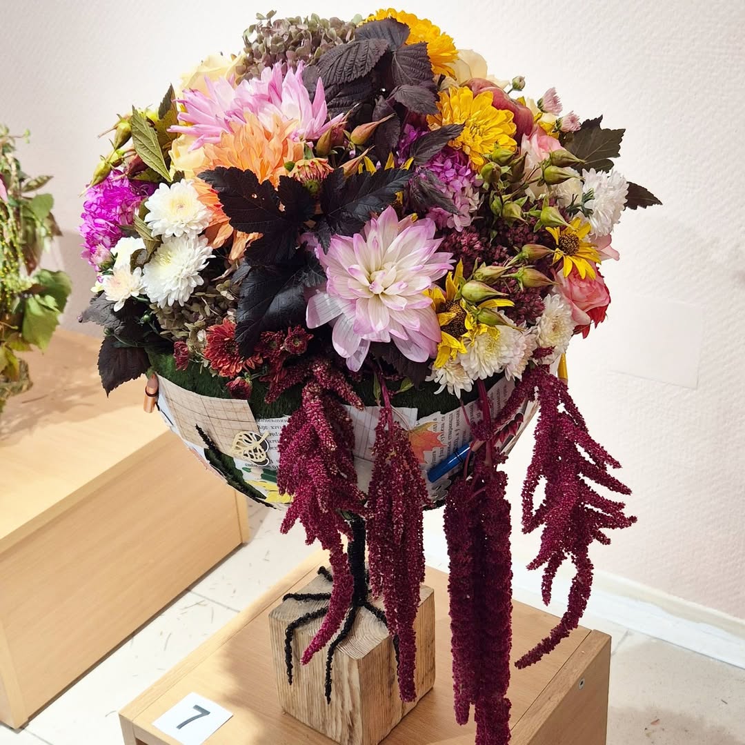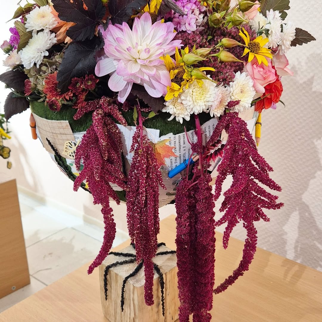 На конкурс «Юный натуралист», который был приурочен ко Дню учителя, Евгения вместе с Наталией Бортник подготовили композицию «Школьная страна». Были использованы такие живые садовые цветы, как цинии, георгины, гортензия, амарант и другие растения. Все они выращены на участке учреждения. Также привлекают внимание декоративные элементы ручной работы, скрапбукинга (техника создания красивых бумажных открыток и альбомов).