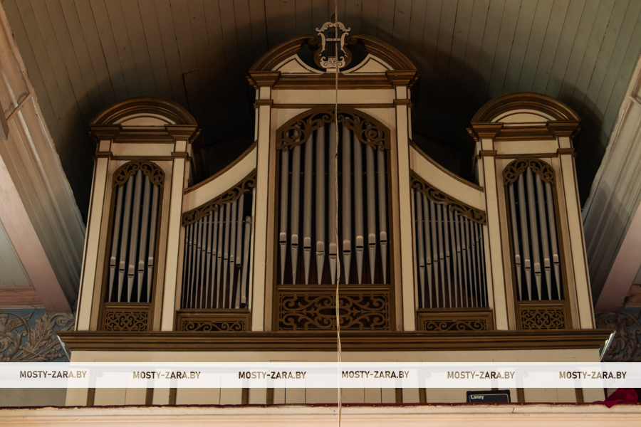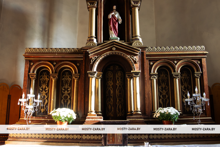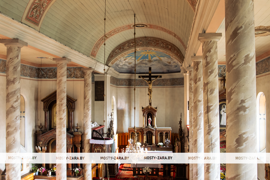 Деревянный храм два века спустя сменился каменным, который, к счастью, и сохранился до наших дней. Уникальная деталь памятника позднего классицизма ‒ деревянные колонны из сибирского кедра, что украшают костёл внутри. Порой они всё ещё «плачут» смолой.