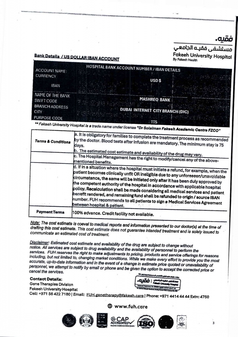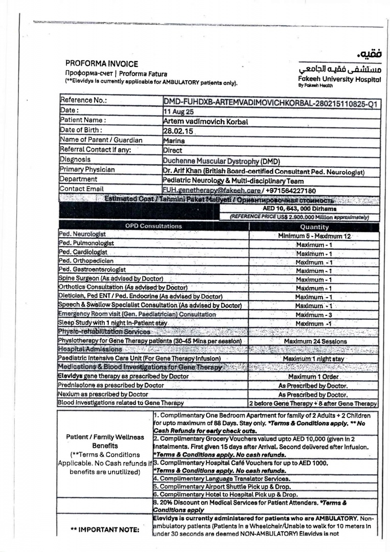 Стоимость лекарства — 2 900 000 долларов США. Препарат не зарегистрирован в России, поэтому лечение возможно только за рубежом, в ОАЭ. Государство не может оплатить его, и семья вынуждена собирать средства самостоятельно.