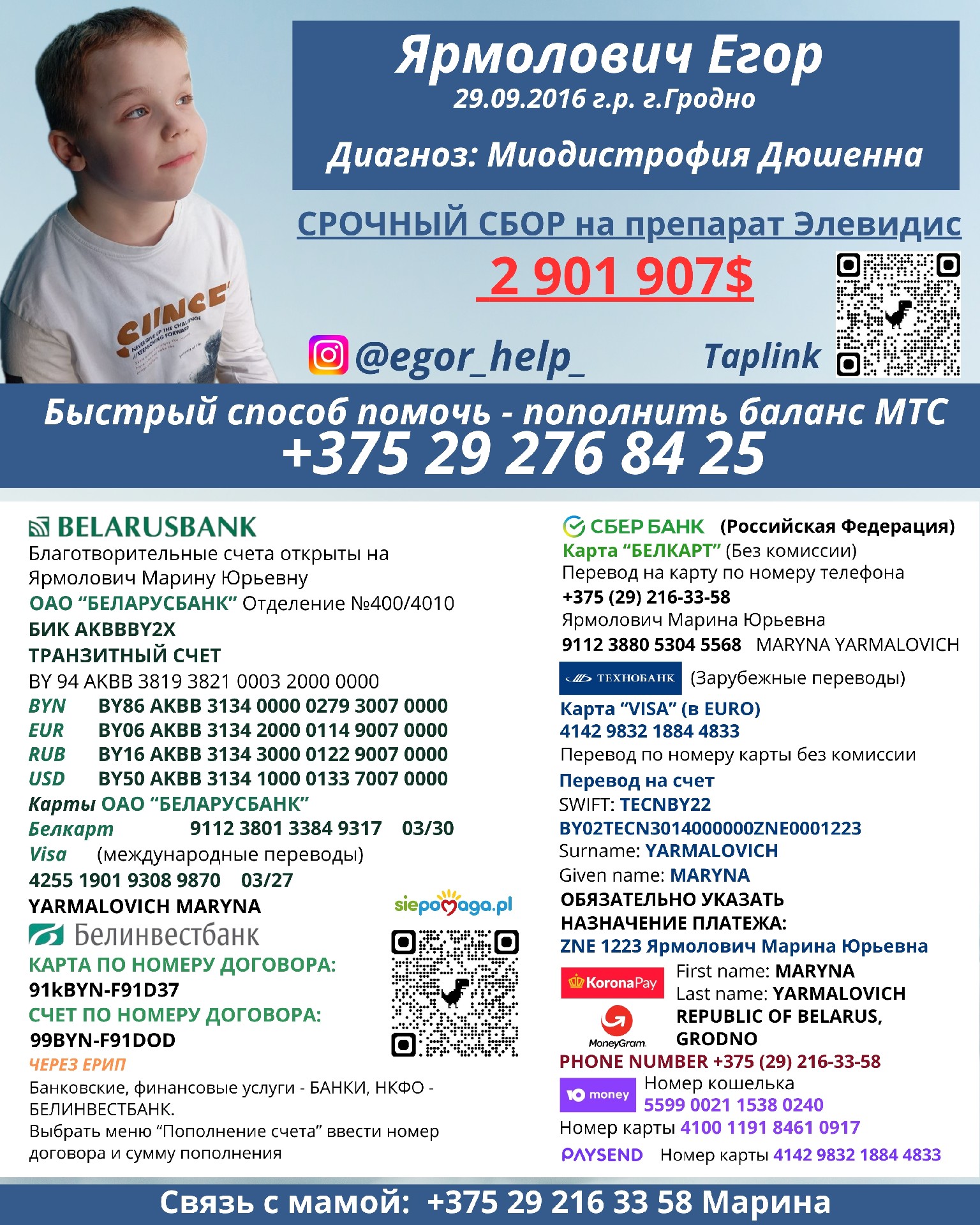 Благотворительные счета открыты на имя матери мальчика — Ярмолович Марины Юрьевны.