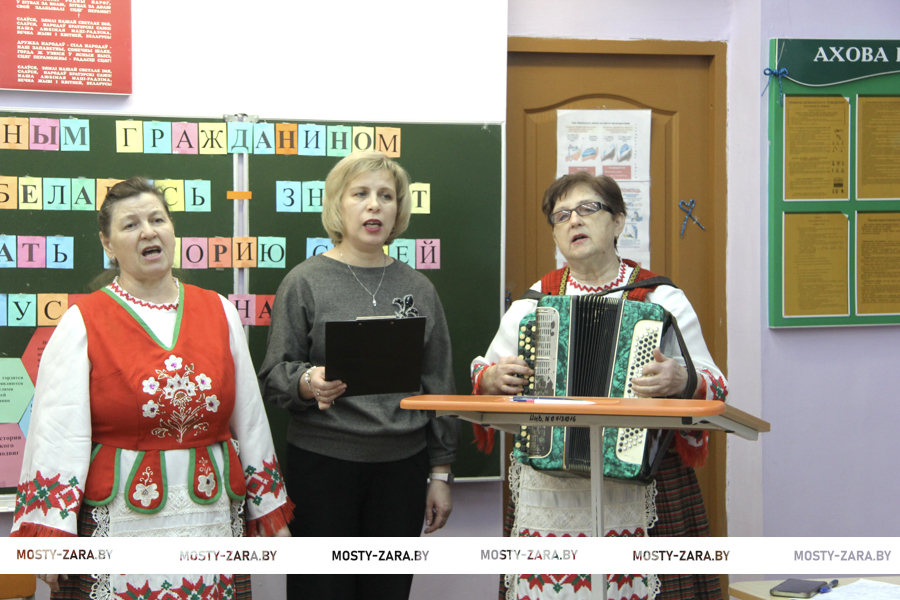 Очень интересным было выступление учителей школы – участников вокальной группы «Другое дыханне» Эмилии Евсейчик, Веры Пашкевич и Татьяны Головач. В национальных белорусских костюмах под звуки баяна они исполнили песню о родной стране. А Вера Владимировна рассказала о национальных белорусских праздниках, прочитала своё задушевное стихотворение.