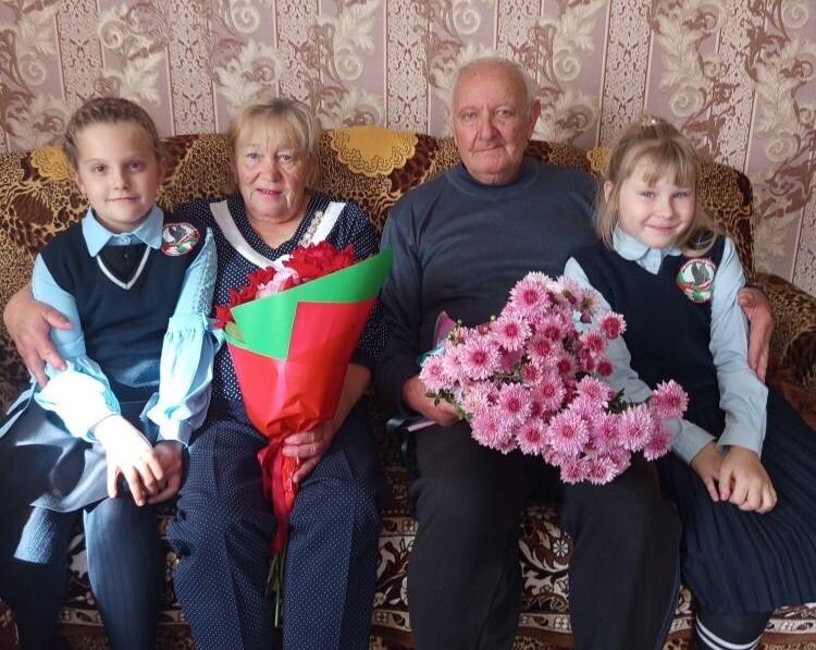 Учащиеся начальных классов поздравляют бывшего директора школы Казимира Павловича Савко и учителя русского языка и литературы Людмилу Викентьевну Тарасевич.